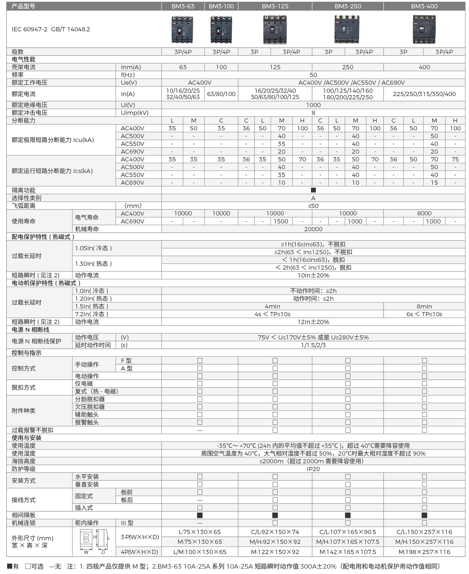 BM3 塑料外殼式斷路器( 以下簡稱斷路器),其額定絕緣電壓為1000V 適用于交流50Hz,額定工作電壓690V 及以下,額定工作電流至1250A 的電路中作不頻繁轉換及電動機不頻繁啟動之用。斷路器具有過載、短路、欠電壓和電源端N 相斷線保護功能,能保護線路、電源設備不受損壞。